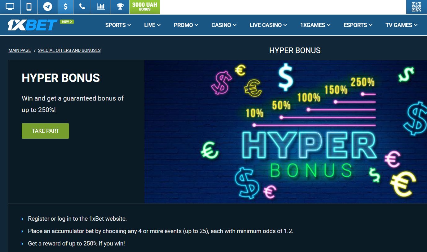 You can add more than 25 bets, but the bonus will not grow. The maximum winnings per accumulator are $33,437. One of the essential advantages of the Hyper Bonus is the lack of wagering requirements. This bonus is equivalent to a regular win and is immediately credited to the main account. You can withdraw it instantly or use it to get even bigger wins in 1xBet.